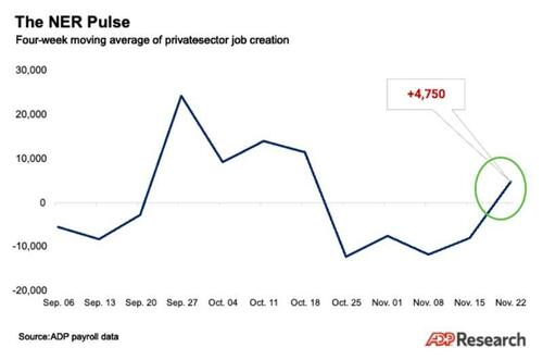 After a dismal few months, the US labor market turned up for the four weeks ending Nov. 22, 2025, private employers added an average of 4,750 jobs a week., according to ADP’s new weekly employment data