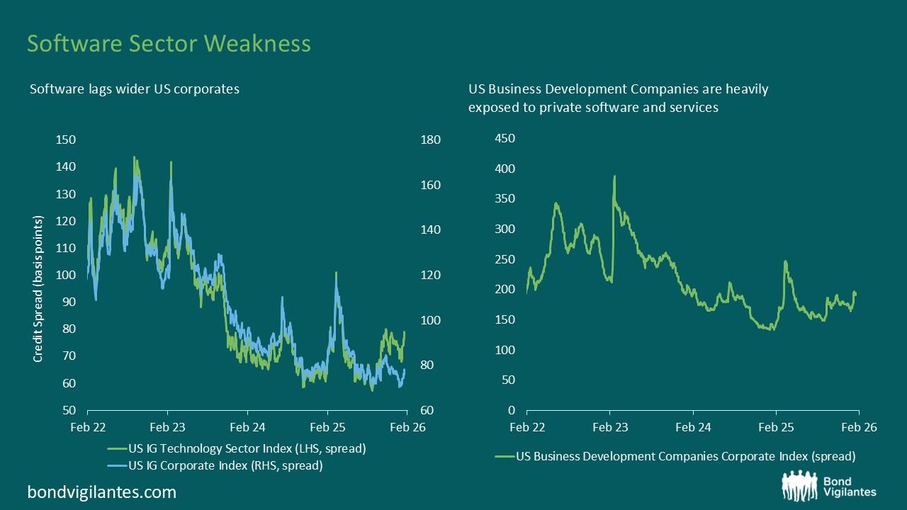 For credit investors, the more important question is whether the equity‑led repricing signals underlying stresses in cashflows, leverage or financing risk. On this point, the picture remains reassuring. Credit spreads have widened and valuations have compressed, especially among lenders to private software companies where sentiment is fragile, but the underlying credit characteristics of most public issuers remain solid. Software revenues are sticky, renewal rates remain high, and long‑term contracts continue to anchor client relationships. What the sector is experiencing reflects sentiment rather than a permanent change in credit fundamentals.