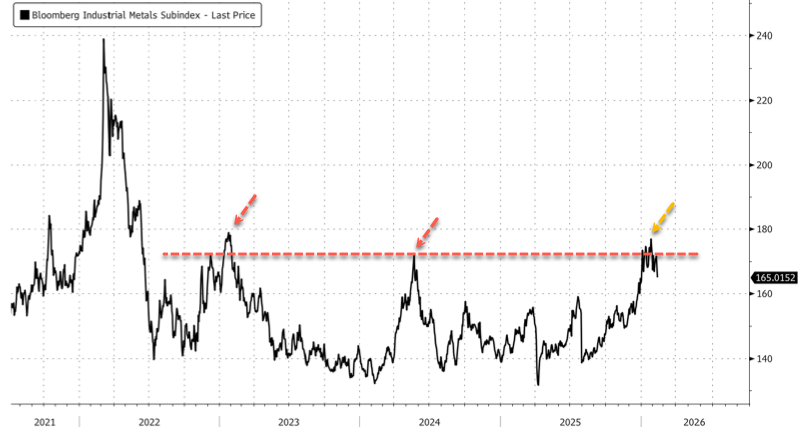 The Bloomberg Industrial Metals Subindex (core contracts: aluminum, copper, nickel, lead, and zinc futures) appears to have formed yet another peak since 2022 and is still trading well below its Covid-era high.