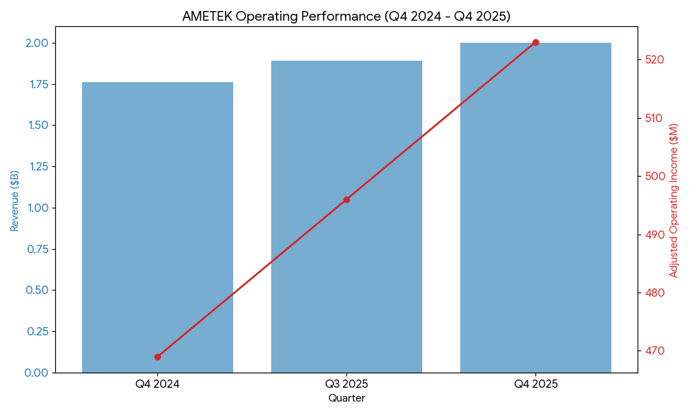 For the fourth quarter ended December 31, 2024, AMETEK reported net sales of $1.82 billion, an increase of 5% compared to the fourth quarter of 2023. Operating income for the period rose 9% to $468.9 million, while operating margins expanded to 25.8%.