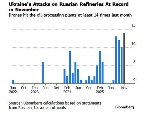 Attacks on Russia’s oil/gas infrastructure jumped to a record last month as the Trump administration rushes to end the four-year war.