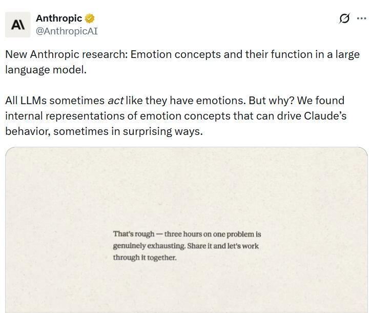“For instance, we find that neural activity patterns related to desperation can drive the model to take unethical actions; artificially stimulating desperation patterns increases the model’s likelihood of blackmailing a human to avoid being shut down or implementing a cheating workaround to a programming task that the model can’t solve.”