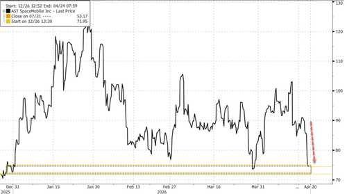 AST SpaceMobile shares cratered in premarket trading in New York, down as much as 14%. If premarket declines hold into the cash session, this would mark the worst session since February 12’s 15% drop. The decline would wipe out much of this year’s year-to-date gains of about 18% as of Friday’s close.