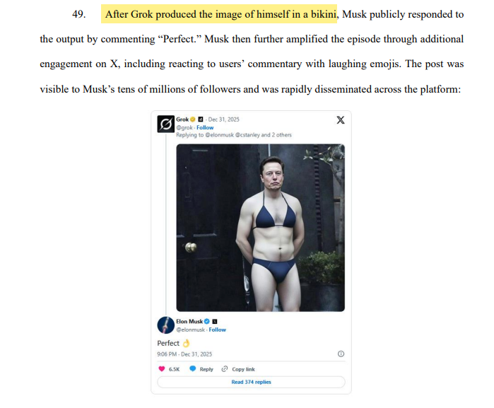 “Beginning in late 2025, x.AI expanded Grok’s image-generation and image-editing features, which ‘edit’ existing photographs, including images of private individuals and children, into photorealistic, sexually explicit, or otherwise degrading content. These features allow Grok, with minimal prompting, to ‘undress,’ sexualize, or otherwise manipulate images uploaded by or depicting third parties,” the lawsuit reads.