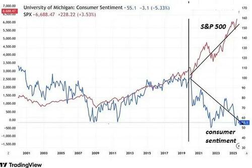 Here is the S&P 500 (SPX) stock market index, representing the wealth of corporations and the top 10% who own their shares, rising at a 45-degree angle, and consumer sentiment, representing the real-world economy, sliding down a 45-degree angle.