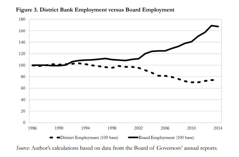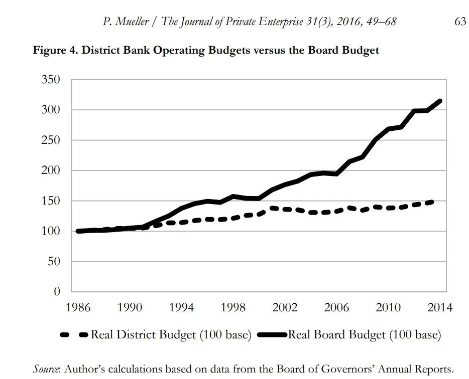 District banks, on the other hand, operate with private-sector participation through their member-bank stockholders, yet they still suffer from bureaucratic bloat because of limited market competition.