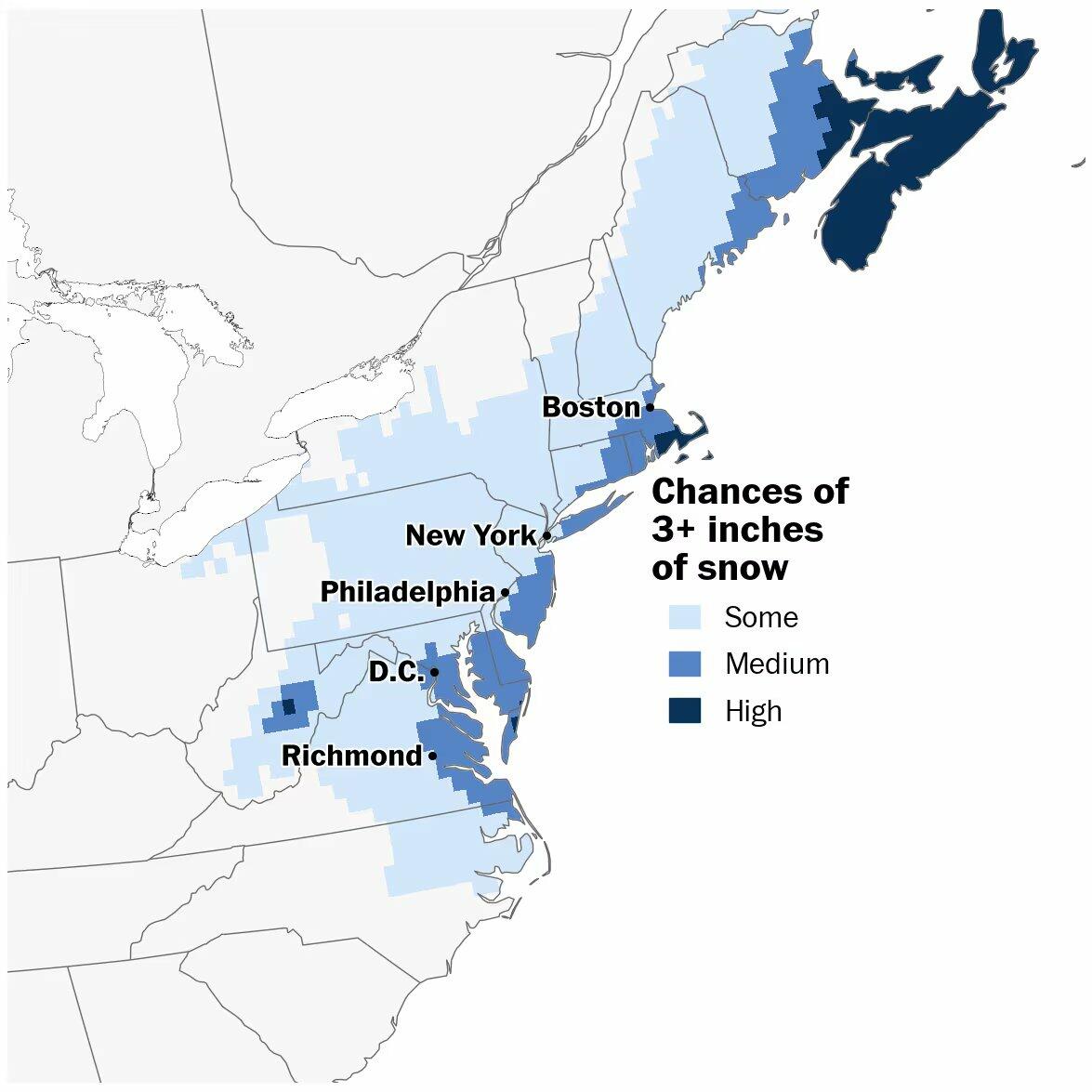 Large stretches of the Interstate 95 corridor – from Washington, D.C., to Philadelphia, to New York, and up to Boston – could be blanketed with accumulating snow. However, at this point, pinning down snowfall forecasts is too premature until confidence improves in the storm’s track.