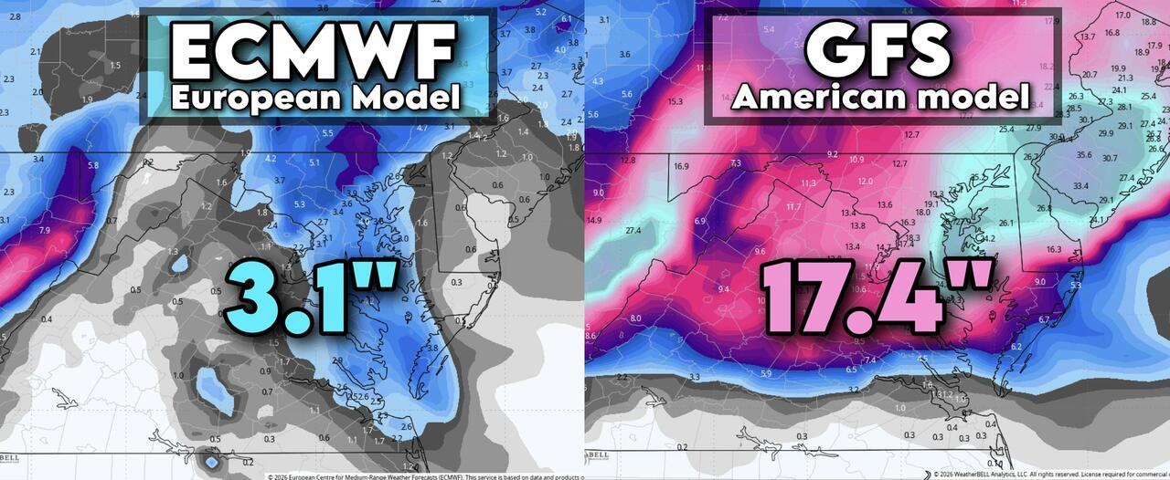 For those traveling to or from the Mid-Atlantic and Northeast this weekend, it’s wise to keep an eye on which model meteorologists favor, because one scenario brings several inches, while the other shows a blockbuster winter event.