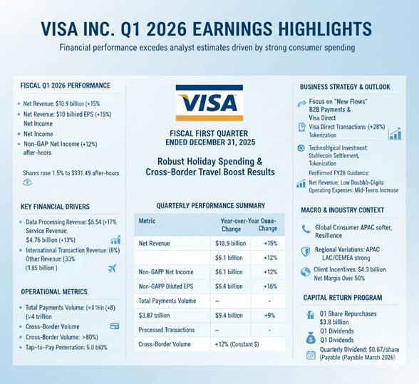 Visa Inc. (NYSE: V) reported a 15% increase in net revenue for its fiscal first quarter of 2026, surpassing analyst estimates as robust holiday spending and cross-border travel volumes offset rising operating expenses. Following the announcement on Thursday, shares of the San Francisco-based payments leader rose 1.5% in after-hours trading to $331.49, reflecting investor confidence […]