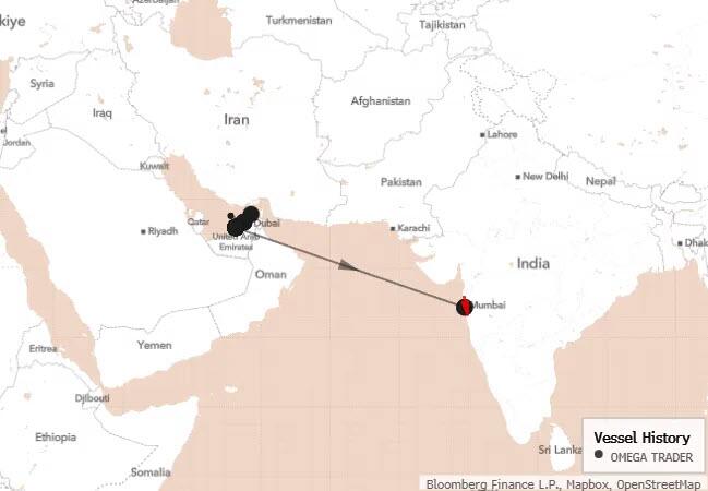 The Omega Trader, managed by Japan’s Mitsui OSK Lines Ltd, signaled over the past few days that it reached Mumbai. Its prior signal before reaching the Indian port city had been from inside the Persian Gulf more than ten days ago, suggesting the tanker had shut off its tracking beacon while making the transit.