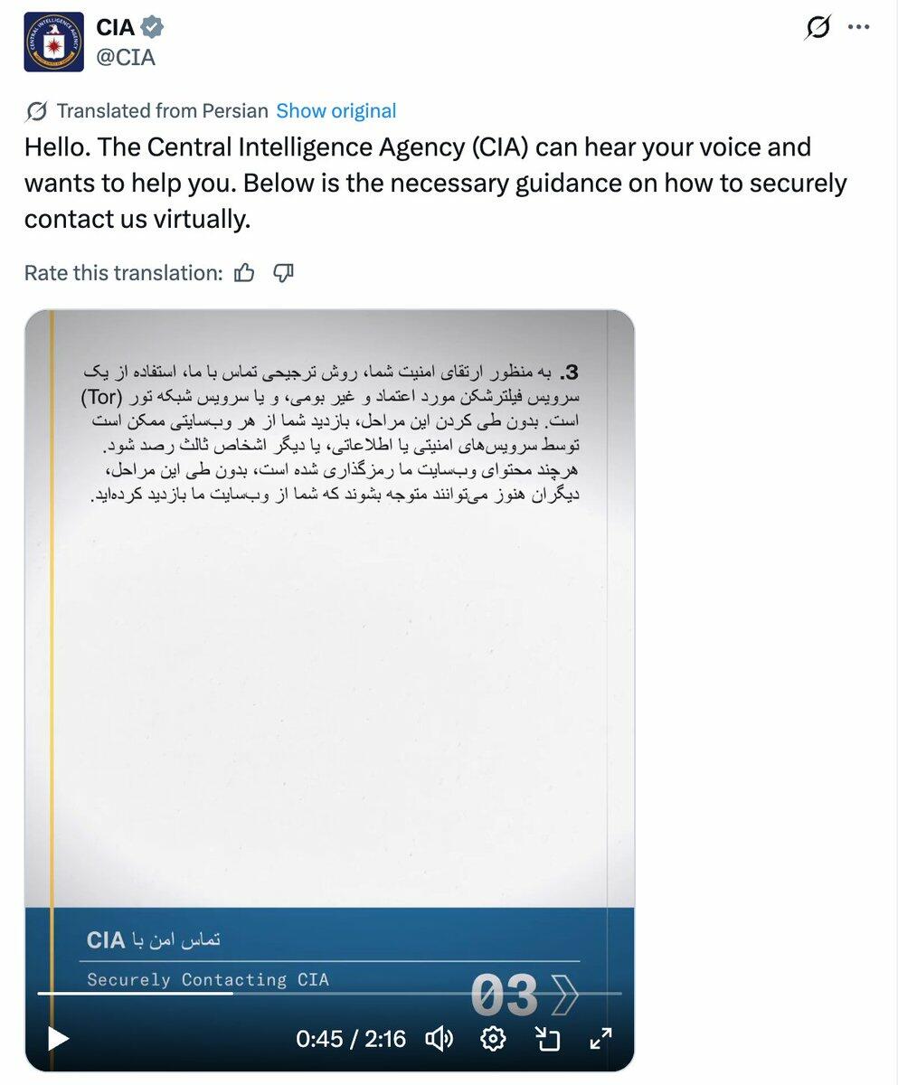 The CIA posted to X, Instagram, and other officially verified platforms a video in Farsi which encourages Iranians to contact the agency, while featuring instructions for using Tor and other encrypted methods to ensure anonymity, and so local Iranian authorities can’t uncover the communications.