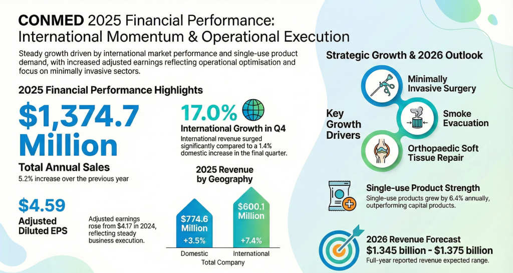 CONMED reported fourth‑quarter 2025 sales of $373.2 million, up 7.9% year‑over‑year on a reported basis and up about 7.1% in constant currency. Domestic revenue growth was modest, while international sales climbed strongly. Full‑year 2025 revenue totaled about $1.375 billion, representing roughly 5.2% growth from 2024.