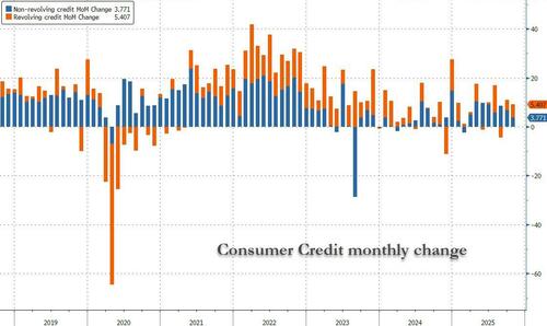 Looking at revolving credit (i.e., credit cards), the increase was $5.407BN to $1.317 trillion, the biggest monthly increase since July, if on the low side compared to the $8.7 billion average monthly increase from 2021 until the end of 2024.