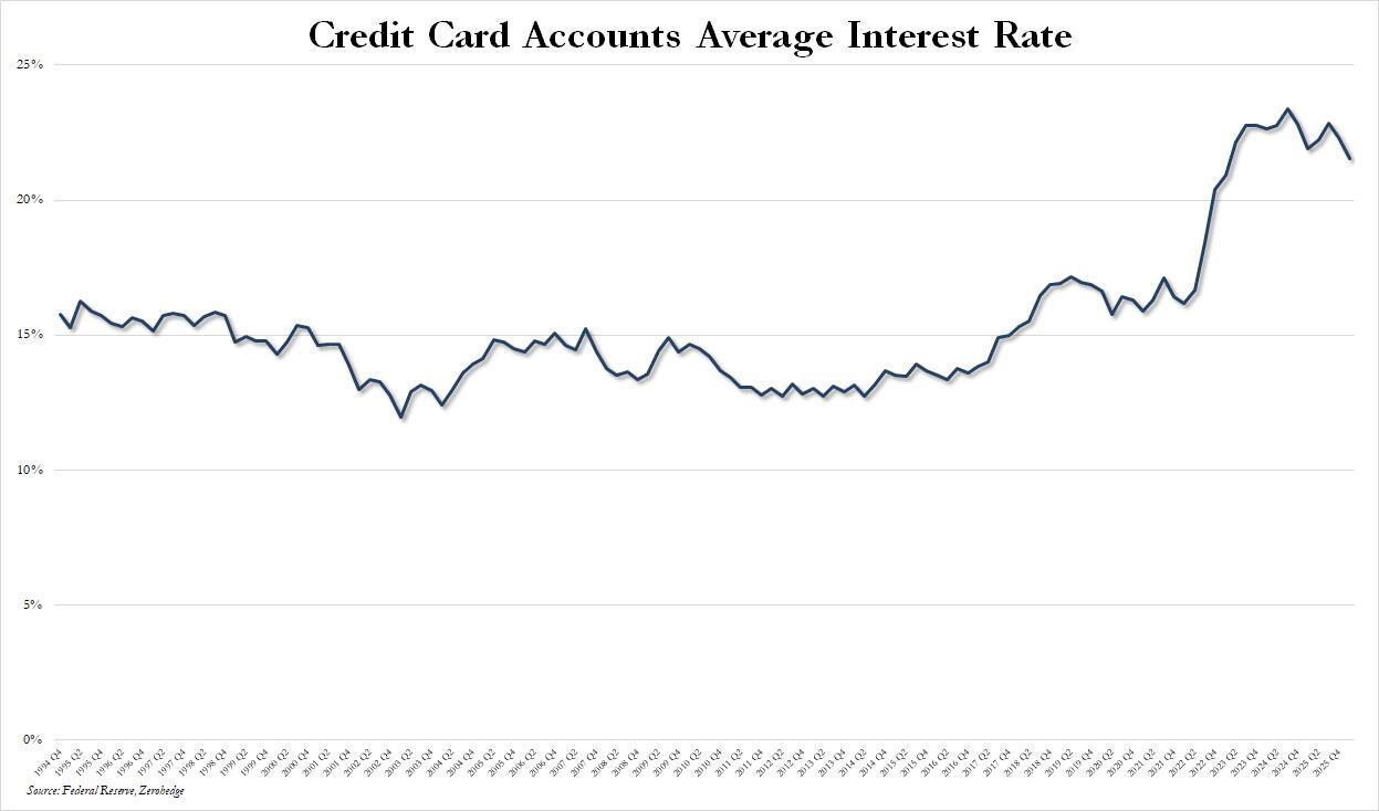 Finally, and this may come as a surprise, following 1.75% in rate cuts by the Fed since September 2024, a move which did nothing for the average rates on credit card accounts through Dec 31, 2025, there was finally a notable drop in the average credit card interest rate, which dropped to 21.52% on March 31, 2026 down from 22.30% three months ago. It appears that all the noise surrounding exorbitant credit card rates in recent months is starting to have an impact.