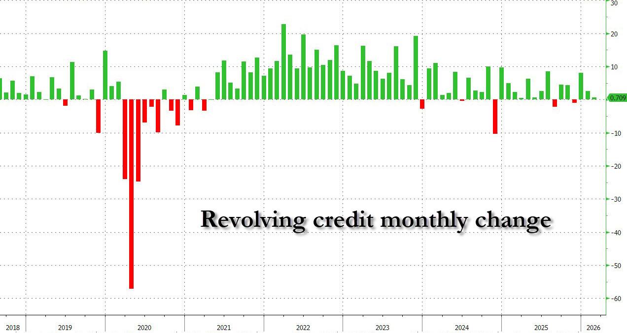 While the monthly jobs report has become a veritable economic random number generator, with every monthly print coming either well below or above the forecast stack, the weekly initial claims report has become its foil – a study in boring reporting, with numbers barely budging week to week, and usually falling right on top of Wall Street estimates. A similar dynamic is emerging for the monthly consumer credit report: following a volatile 2025, when revolving credit swung around wildly in unexpected ways dragging the broader print with it, the last few months have been surprisingly steady, printing right around the consensus expectations with barely any volatility.