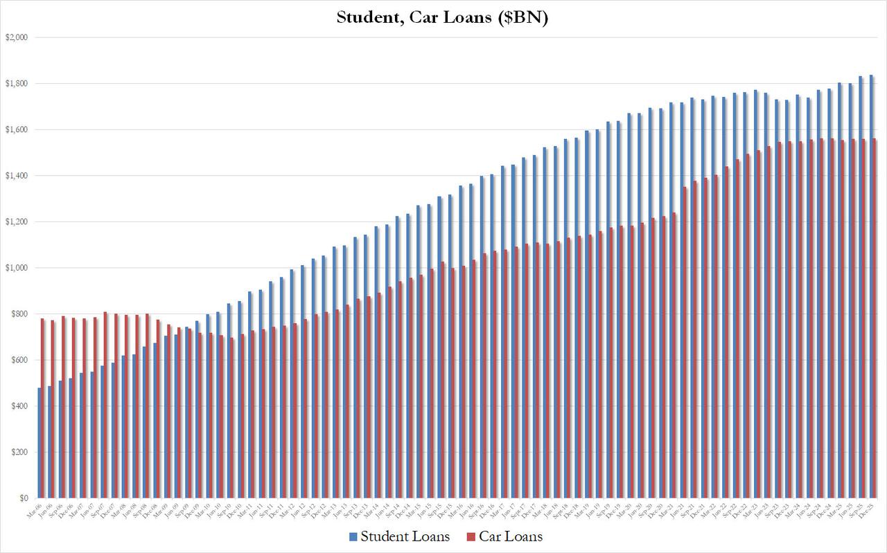 Broken down by its two core components, Student Loans were $1.838 trillion as of Dec 2025, up $5.4 billion for the quarter, while Auto Loans rose a modest $1.5 billion to $1.562 trillion.