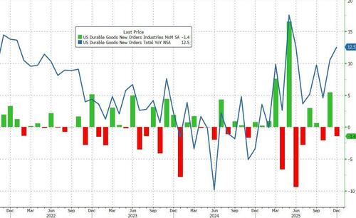 US Durable Goods Orders dropped 1.4% MoM in preliminary December data (slightly better than the 2% decline expected) but well down from the +5.4% MoM surge in November…