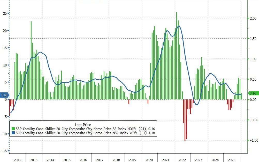 This left the 20-city composite index up just 1.18% YoY – the lowest since July 2023.
