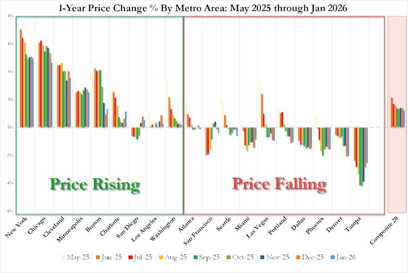 New York leads with a 4.9% annual gain, followed by Chicago at 4.6% and Cleveland at 3.6%, while Tampa fell 2.5%…