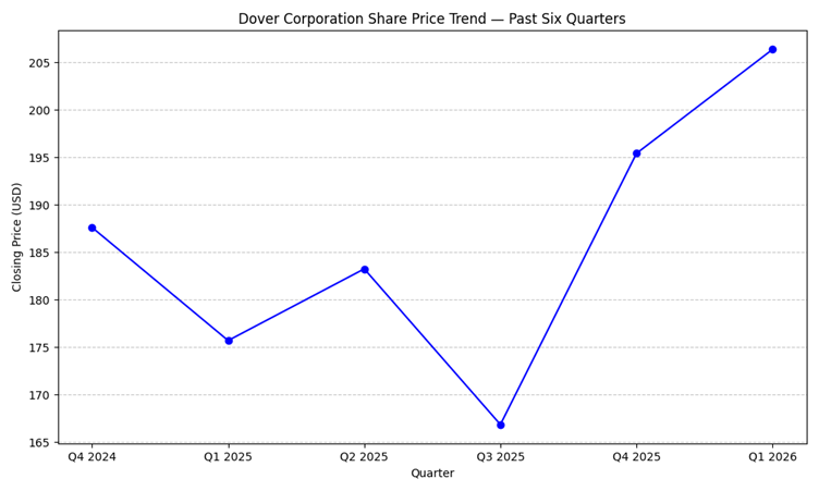 For the quarter ended December 31, 2025, Dover reported revenue of about $2.10 billion, up roughly 9% from the same period a year earlier. On an organic basis, revenue rose by about 4.6%. Net income on a U.S. GAAP basis increased to approximately $275 million from around $238 million in the prior year. Adjusted earnings from continuing operations rose to about $343 million. Adjusted diluted earnings per share were $2.51, above the prior year and above the average analyst estimate. Reported diluted EPS from continuing operations was approximately $2.01, also higher year-over-year.