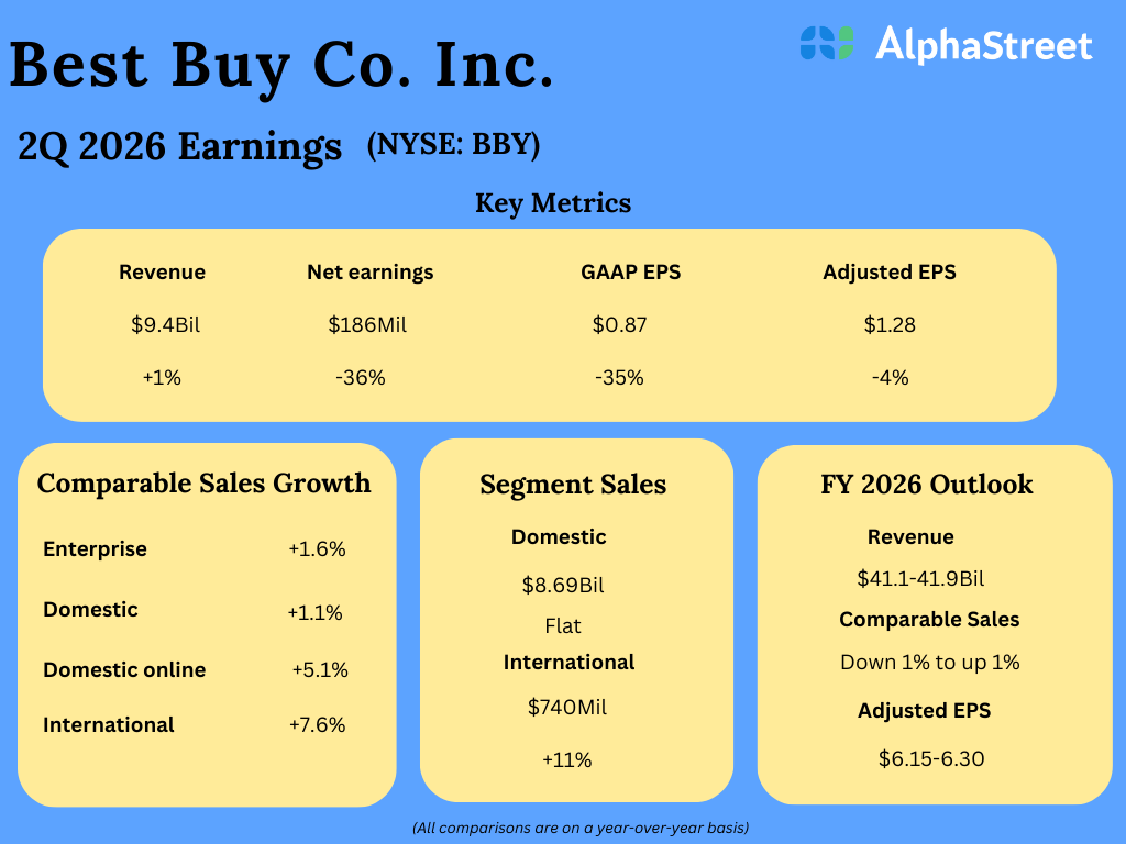 In Q2 FY26, Best Buy’s enterprise revenue moved up to $9.4 billion from $9.2 billion in the corresponding period of fiscal 2025. Comparable sales were up 1.6%. International revenue jumped 11% YoY while domestic revenue remained broadly unchanged during the quarter. Q2 net income was $186 million or $0.87 per share, compared to $291 million or $1.34 per share last year. Adjusted earnings declined 4% annually to $1.28 per share.