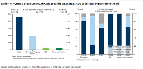 According to Goldman, the EU will activate the ACI if the US escalates tensions further, but without implementing any measures immediately to leave additional time for negotiation. In other words, it is unlikely that any actual implementation of the ACI will take place in 2026 even assuming full-blown trade war returns.