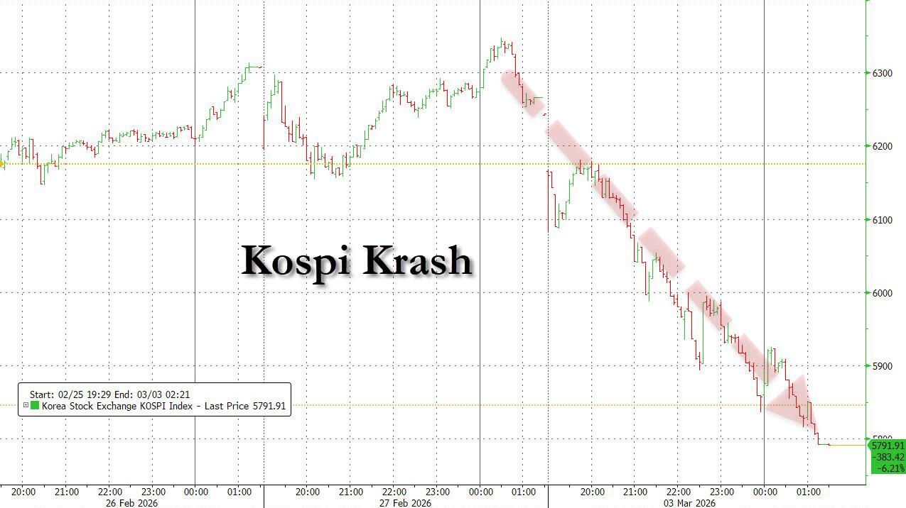 The MSCI Asia Pacific Index dropped as much as 3.1%, setting the gauge on track for its worst two days in 11 months after US and Israeli strikes on Iran. One of the day’s most pronounced moves came in South Korea, which slumped 7.2% in its worst session since August 2024, as markets reopened after a holiday. Samsung Electronics and SK Hynix dropped more than 10%.