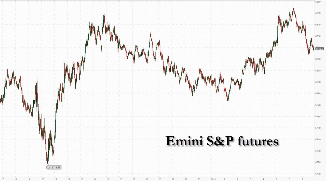 In premarket trading, Mag 7 were mixed: Nvidia rose 0.6% after billionaire Leo KoGuan said he bought 1 million shares of the semiconductor giant and that he is “convinced AI is NOT a bubble, it is only the beginning.” (Tesla +1.1%, Meta +0.05%, Microsoft -0.5%, Alphabet -0.4%, Amazon -0.3%, Apple -0.4%)