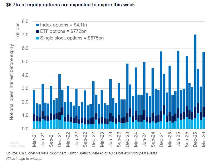 Meanwhile, traders braced for a historic amount of March options expiry. Roughly $5.7 trillion in notional options tied to individual US stocks, indexes and exchange-traded funds are set to expire on Friday in the quarterly event that traders have dubbed the “triple-witching”, the largest March expiry in 30 years and one the 4th largest ever. That includes $4.1 trillion in index contracts, $772 billion in exchange-traded funds and $875 billion in single-stock options. The event has a reputation for triggering abrupt price swings as large pools of derivatives exposure suddenly vanish. It also tends to reset dealer gamma sharply lower, unleashing an “unclenching” that lead to higher volatility in subsequent days. The scale of this week’s expiration is also notable relative to the broader market. At 8.4% of Russell 3000 Index market capitalization, it’s well above historical norms, amplifying the potential for positioning-driven flows.