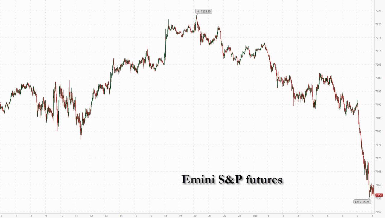 Futures are sharply lower after closing at a new all time high yesterday. The market’s hottest theme took a knock from a report that OpenAI failed to meet internal targets, fueling internal concerns that it may struggle to support its spending on AI infrastructure, the WSJ reported. OpenAI partners including Oracle, CoreWeave and AMD fell in premarket trading, while SoftBank tumbled 10% in Japan. Resurgent optimism about AI had prompted the market’s charge as the rest of the market lagged due to rising oil prices. Wednesday’s earnings from four hyperscalers will offer the rally another test.