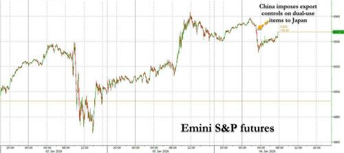 US equity futures are flat with small caps underperforming as geopolitics dominate headlines, including aftershocks from the Maduro seizure and a potential US/EU deal that provides a security guarantee for Ukraine potentially with American soldiers maintaining a presence in Ukraine. As of 8:00am ET, S&P futures are flat as a rotation into regional shares broadened and investors awaited fresh data to gauge the outlook for Federal Reserve interest rates; Nasdaq futures gain 0.2% even as Mag 7 names are weaker premarket ex-NVDA which is leading Semis higher after Jensen Huang’s CES presentation. Futures took a brief spill overnight just around 3am ET when China announced it would launch export controls on Japan, which is negative for heavy machinery; futures then promptly recovered. Defensives are leading Cyclicals ex-Energy. Bond yields are higher by 1-2bp with USD also bid. Major European markets are mixed with UK leading and France lagging. Asian stocks are off to their best start since 2012 with the MXAP up 3% YTD. Today’s US economic calendar includes December final S&P Global US services and composite PMIs at 9:45am. Scheduled Fed speakers include Barkin (8am) and Miran (8:30am)
