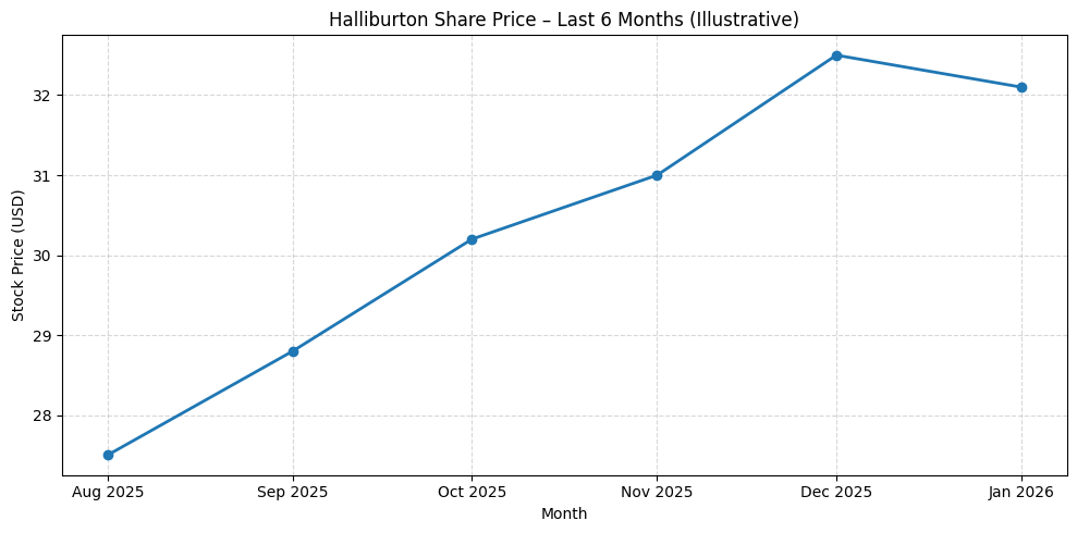 The shares have traded near the upper end of their 52-week range, which spans roughly the mid-20s to just above $33. Halliburton stock has gained about 15% over the past year and has risen steadily over the last six months, outperforming several peers in the oilfield services sector.