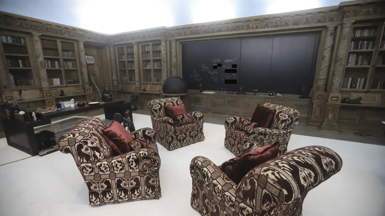 A large sitting room with a chalkboard…