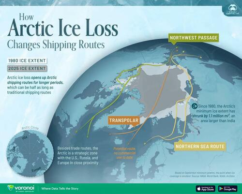 This graphic, via Visual Capitalist’s Dorothy Neufeld, shows how Arctic ice loss is redrawing shipping routes, based on data from multiple sources, including NASA, World Bank, NOAA, and ArcData.