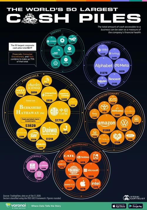 This chart, via Visual Capitalist’s Boyan Girginov, shows the 50 companies with the largest cash holdings, using data from TradingView to highlight who is sitting on the largest war chests.