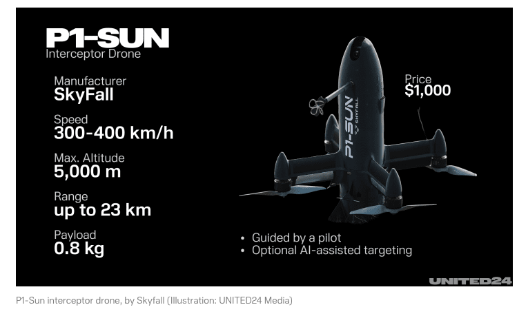 Tuned to outrun Shahed drones, this model has a proven speed of roughly 280 km/h, can reach up to 7 kilometers in altitude, has a range of up to 37 kilometers, and has an endurance of up to 15 minutes, the company says.
