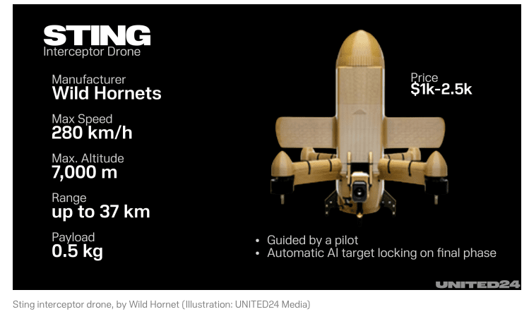 The interceptor can be guided by a pilot and, through AI, automatically lock the target during its final phase. The model has a daylight and a thermal camera, allowing it to detect Shahed engine heat at night. It can hold some warheads weighing 500 grams, according to the company.