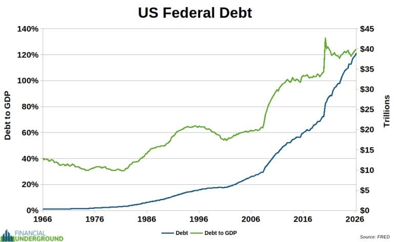 The federal debt has exceeded $39 trillion, representing more than 124% of GDP.