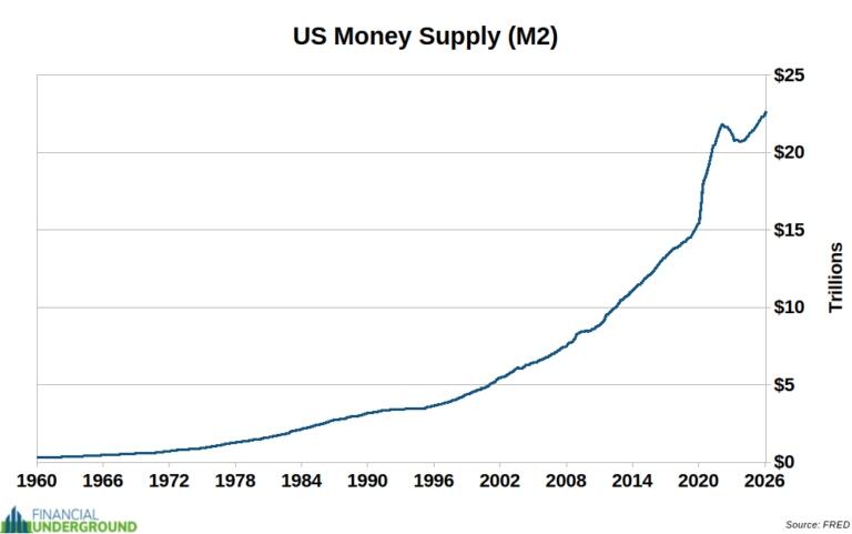 The long-term trend is obvious. The balance sheet only goes one direction: up. And the implication is unavoidable. Every time the Fed expands its balance sheet, it debases the currency. This isn’t an accident or a temporary policy error — it’s the core feature of the system.
