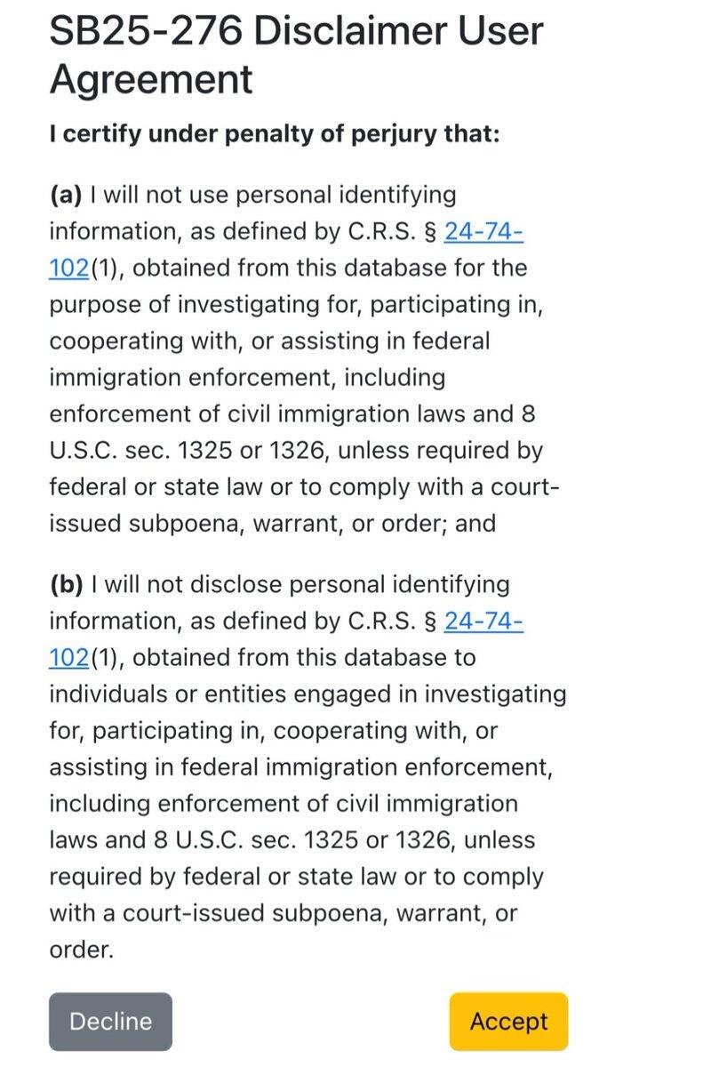 At the same time, the state has moved forward on Senate Bill 25-276, which imposes a threshold condition for state e-filings that requires lawyers to certify annually “under penalty of perjury,” that they will not use “personal identifying information” from the system to help federal immigration enforcement.