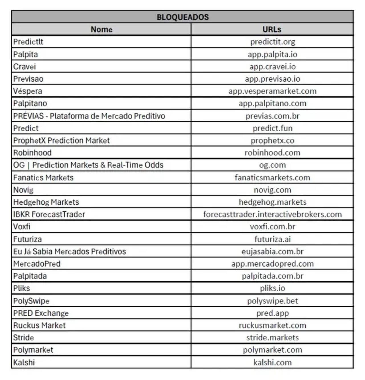 The blocked platforms include a mix of international and Brazil-focused services, with major names including Kalshi, Polymarket, PredictIt, Robinhood (via its forecasting feature) and Fanatics Markets.