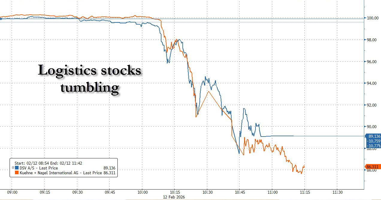 FIrst it was SaaS (in particular, and Software in general), then Private Credit, then Insurance Brokers, then it was financials/brokers that were hammered on Tuesday, then real estate service stocks tumbled yesterday, and today it is the turn of Logistics stocks to plunge as investors followed the bouncing AI disruption ball and freaked out over the sector’s vulnerability to the newest crop of artificial intelligence applications and tools that can disrupt countless industries.