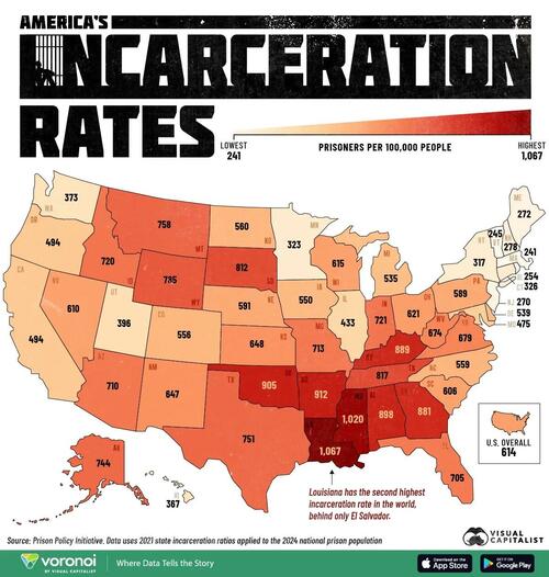 This graphic, via Visual Capitalist’s Dorothy Neufeld, shows prisoners per 100,000 people by state, based on data from the Prison Policy Initiative.