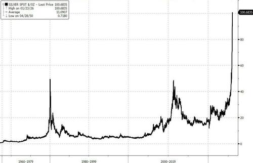 What first came to mind as silver broke above the $100 level was Warren Buffett’s late-1990s bet on the precious metal. Berkshire Hathaway accumulated 129.7 million ounces of physical silver, or about 4,000 metric tons, ahead of the Dot Com bubble crash. The position was disposed of around 2006, generating a substantial profit for Berkshire.