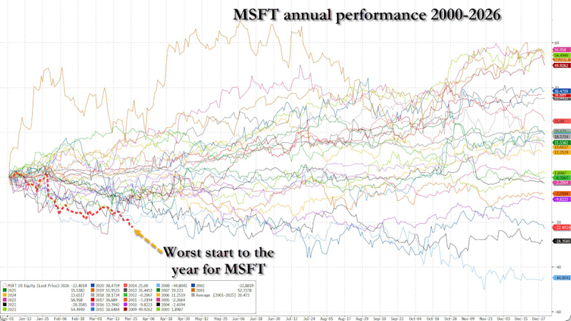 Microsoft shares were trading lower Thursday afternoon, leaving the stock deeper in bear-market territory and down about 24% on the year. Seasonal data suggests it is the worst start to a year for Microsoft on record.