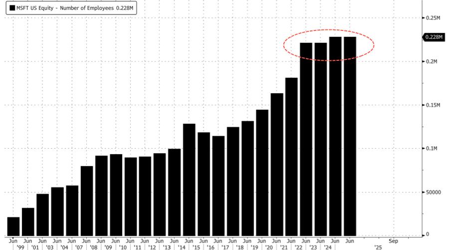 Microsoft reduced headcount by 15,000 last year. The company ended 2025 with 228,000 full-time employees, the same amount as a year earlier, according to Bloomberg data. Hiring momentum has certainly leveled off after hiring sprees that began in 2016 and accelerated in the early days of Covid.