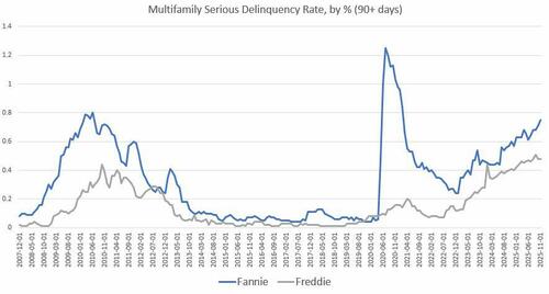 Freddie Mac’s delinquency report, on the other hand, shows delinquencies above the Great-Recession peak. During November, Freddie reported multifamily serious delinquency rate was 0.48 percent. That’s unchanged from October 2025, but up from November 2024’s level of 0.41 percent.