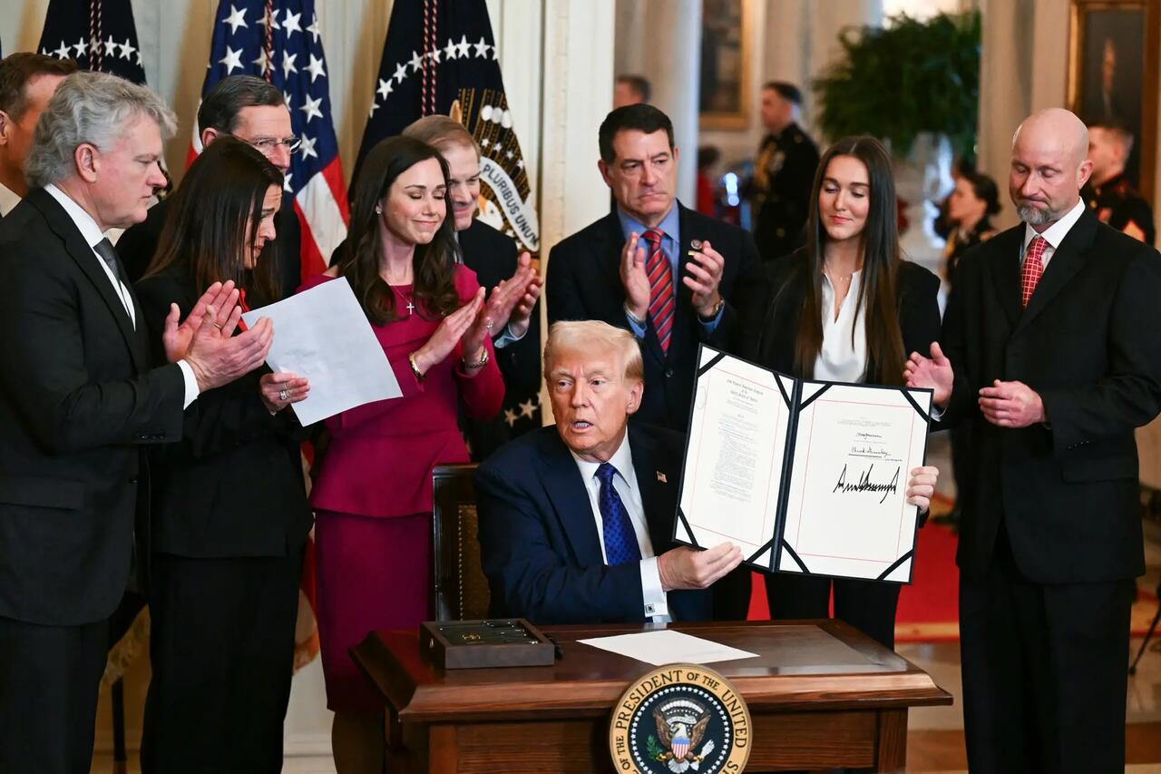 President Donald Trump signs the Laken Riley Act in the East Room of the White House on Jan. 29, 2025. The Laken Riley Act, which mandates the detention of illegal immigrants charged with theft-related crimes, is named for a 22-year-old student murdered by a Venezuelan national with no legal papers who was wanted for shoplifting. Pedro Ugarte/AFP via Getty Images