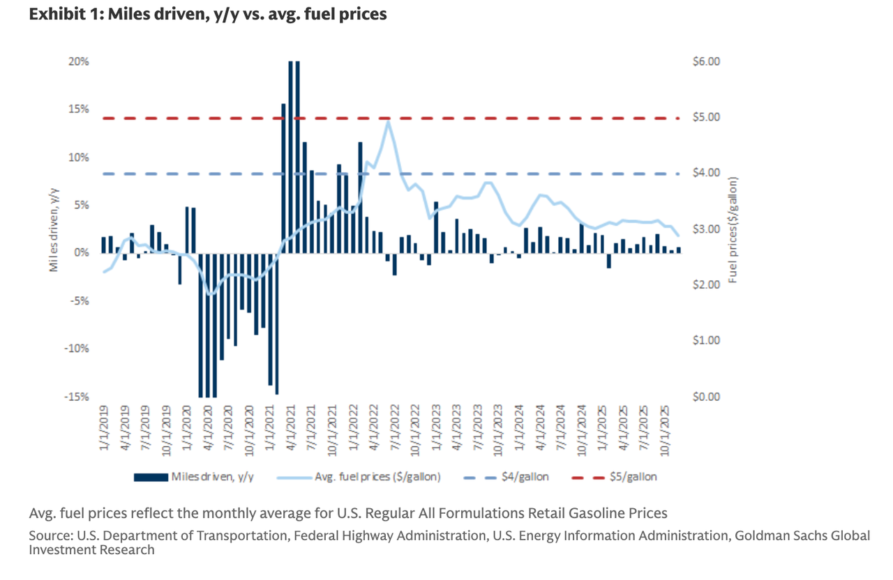 “Historically, when retail gas prices increase (especially above the $3/gal psychological threshold, although that’s been rebased higher), consumers make the concerted decision to drive less, don’t always fill up their tanks (i.e., lower fill rates),” Herzog told clients on Friday.