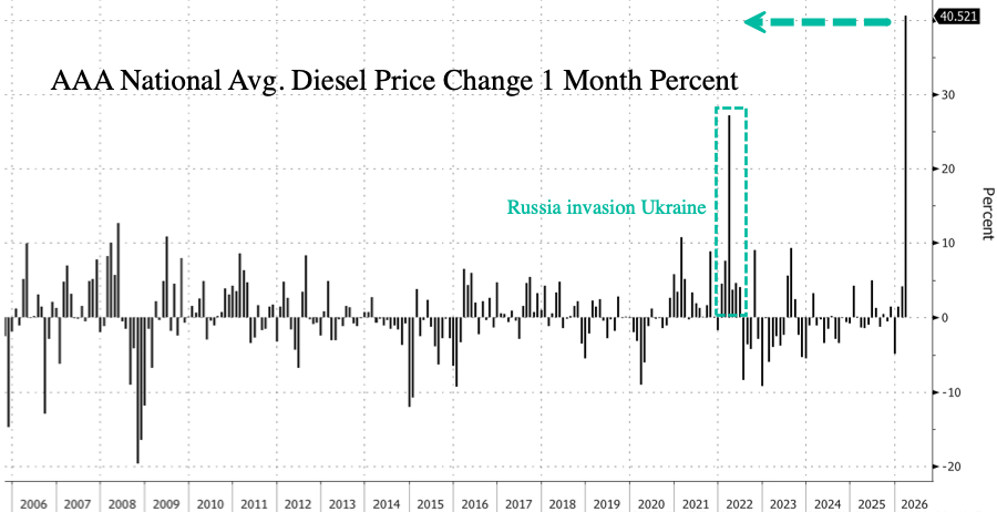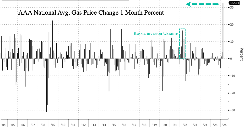 The vertical move in gasoline and diesel this month, according to AAA data, is record-setting. Gas prices at the pump have jumped nearly 33% on the month, far outpacing the Russia-Ukraine invasion in 2022 or the Iraq war, with data dating back to 2005. The shock here will certainly leave some cash-strapped drivers dialing back miles on the road.